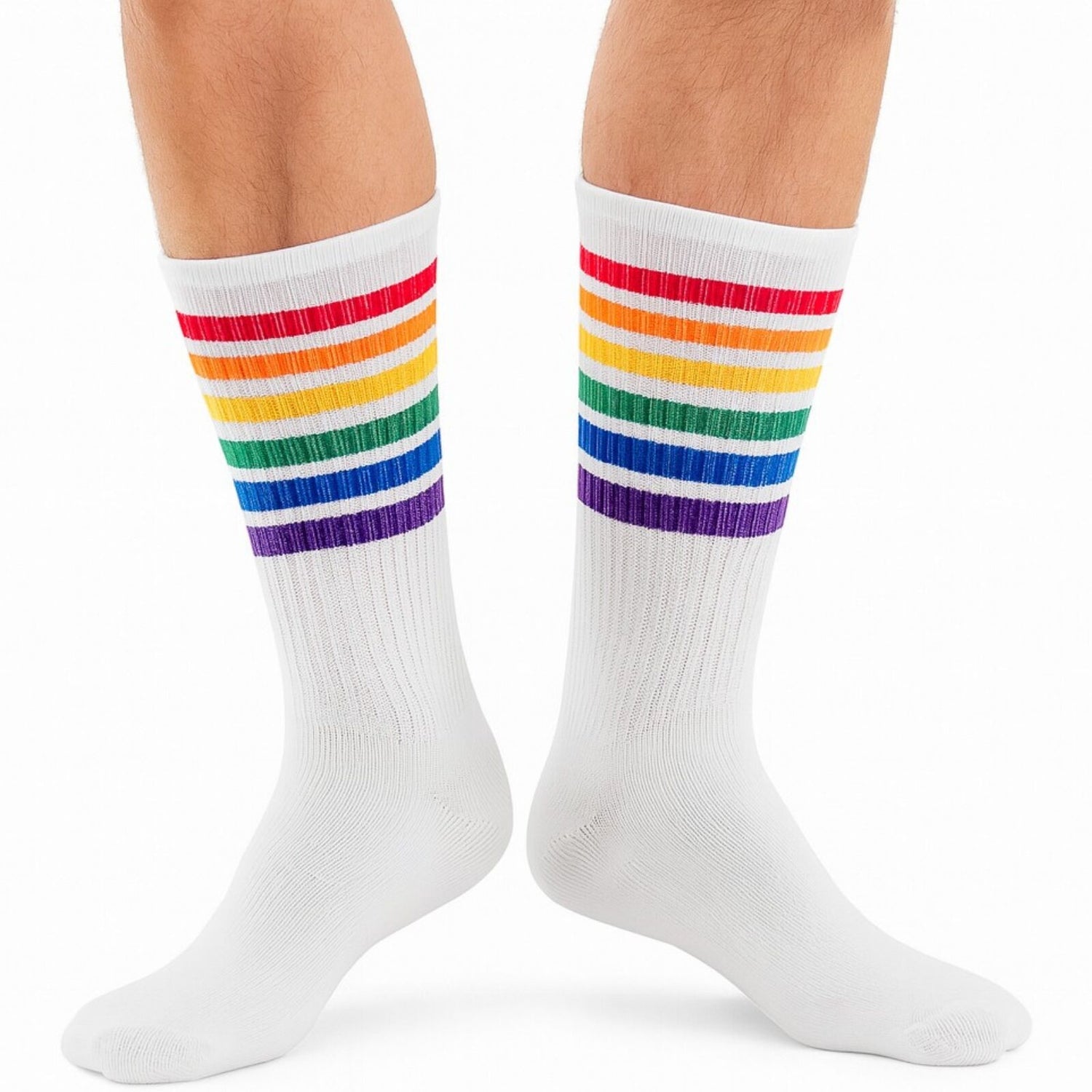 Design: White crew-length socks with a rainbow stripe at the cuff.