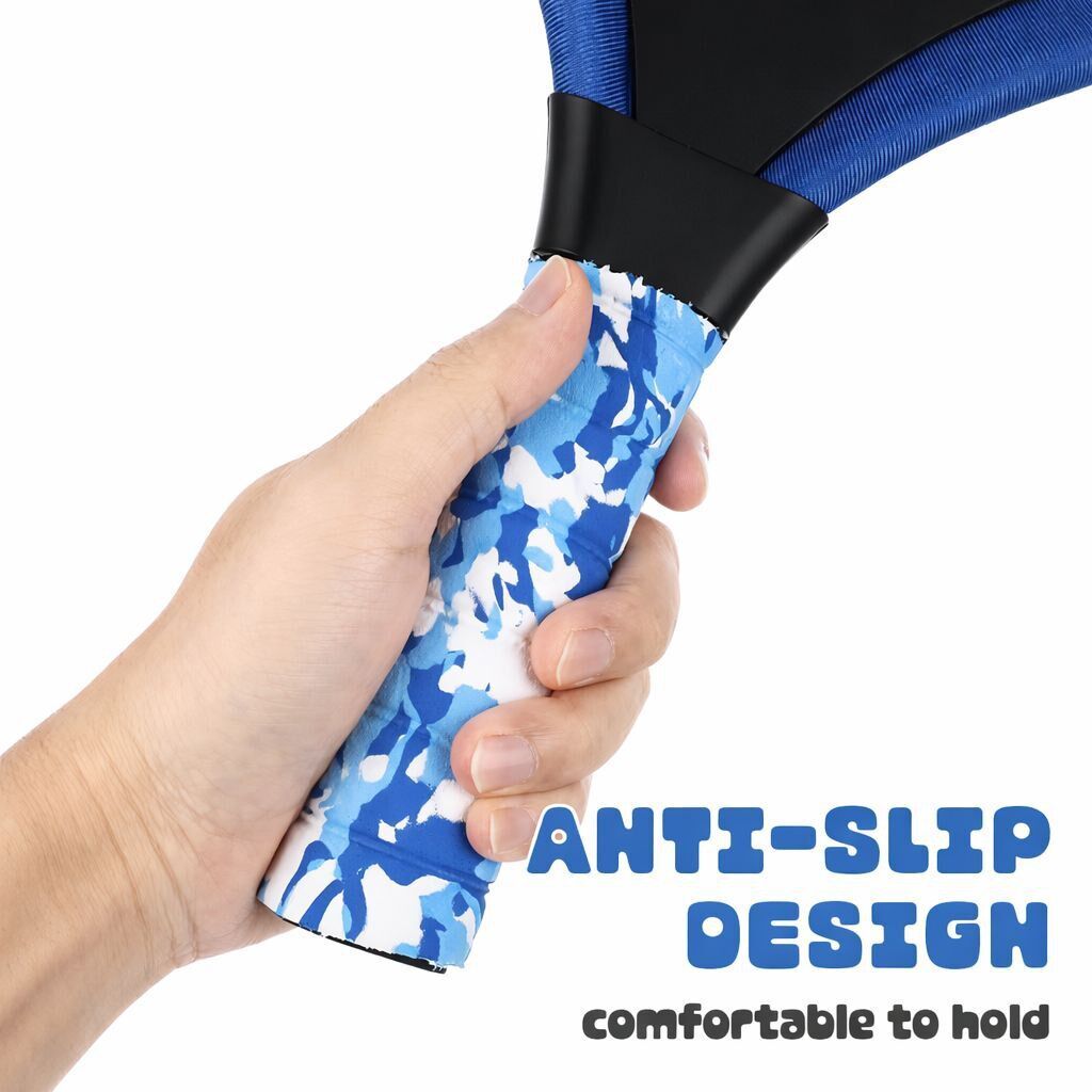 - Racket design: Features a sturdy rim with soft mesh stringing and a camouflage-patterned grip handle.