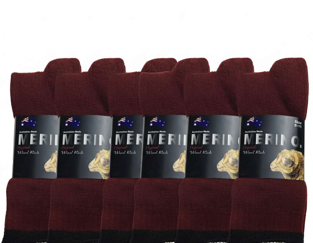 6 Pairs MERINO WOOL SOCKS Mens Heavy Duty Premium Thick Work Socks Cushion in Burgundy