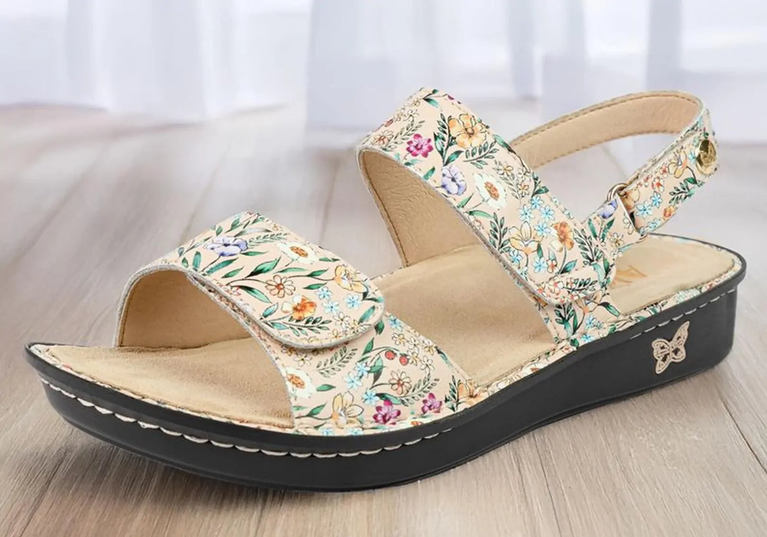 Step into sunshine and style with the Alegria Verona Sandal in Summer Thyme. Featuring a delicate floral-printed leather upper, this slingback sandal combines elegance with Alegria’s signature comfort technology. With three adjustable straps, a supportive mini-rocker outsole and a removable ergonomic footbed, the Verona delivers the perfect balance of style, fit, and support — ideal for busy days or relaxed weekends alike.