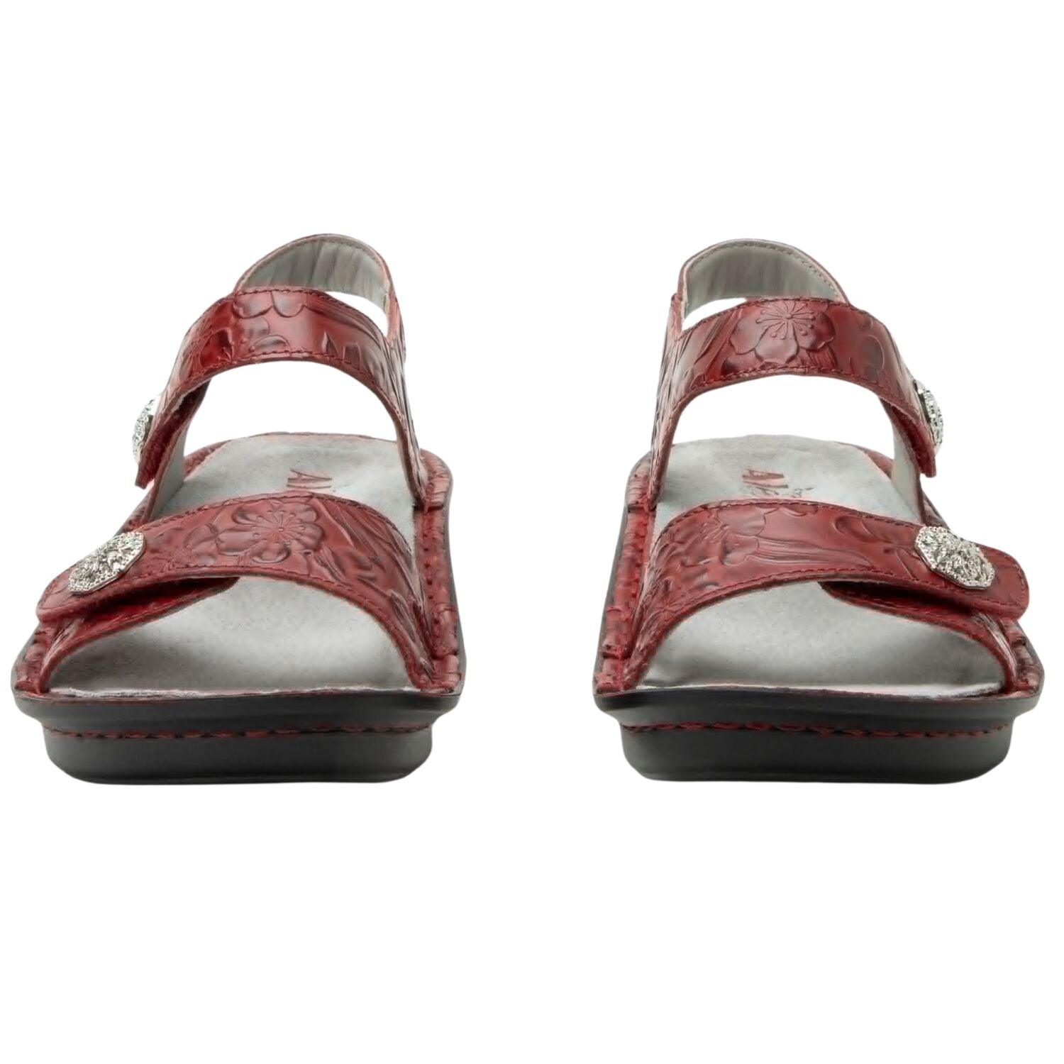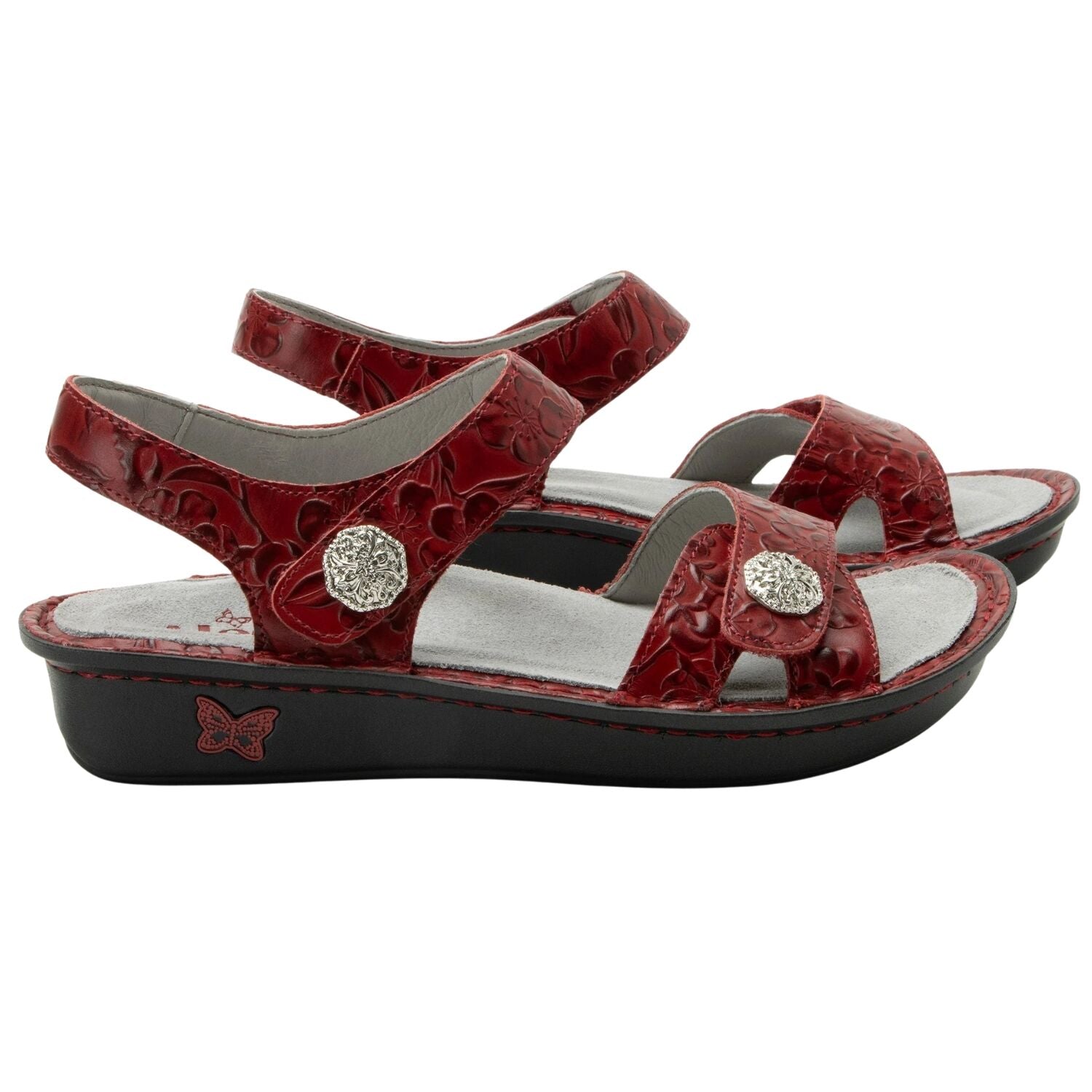 Turn up the vibrance with the Alegria Vienna Slingback Sandal in Loretta Roja. Crafted from embossed red leather with subtle floral texture and metallic accents, this sandal delivers a stunning mix of confidence and comfort. With Alegria’s signature ergonomic footbed and mini-rocker outsole, every step feels as good as it looks — smooth, cushioned, and perfectly supported.