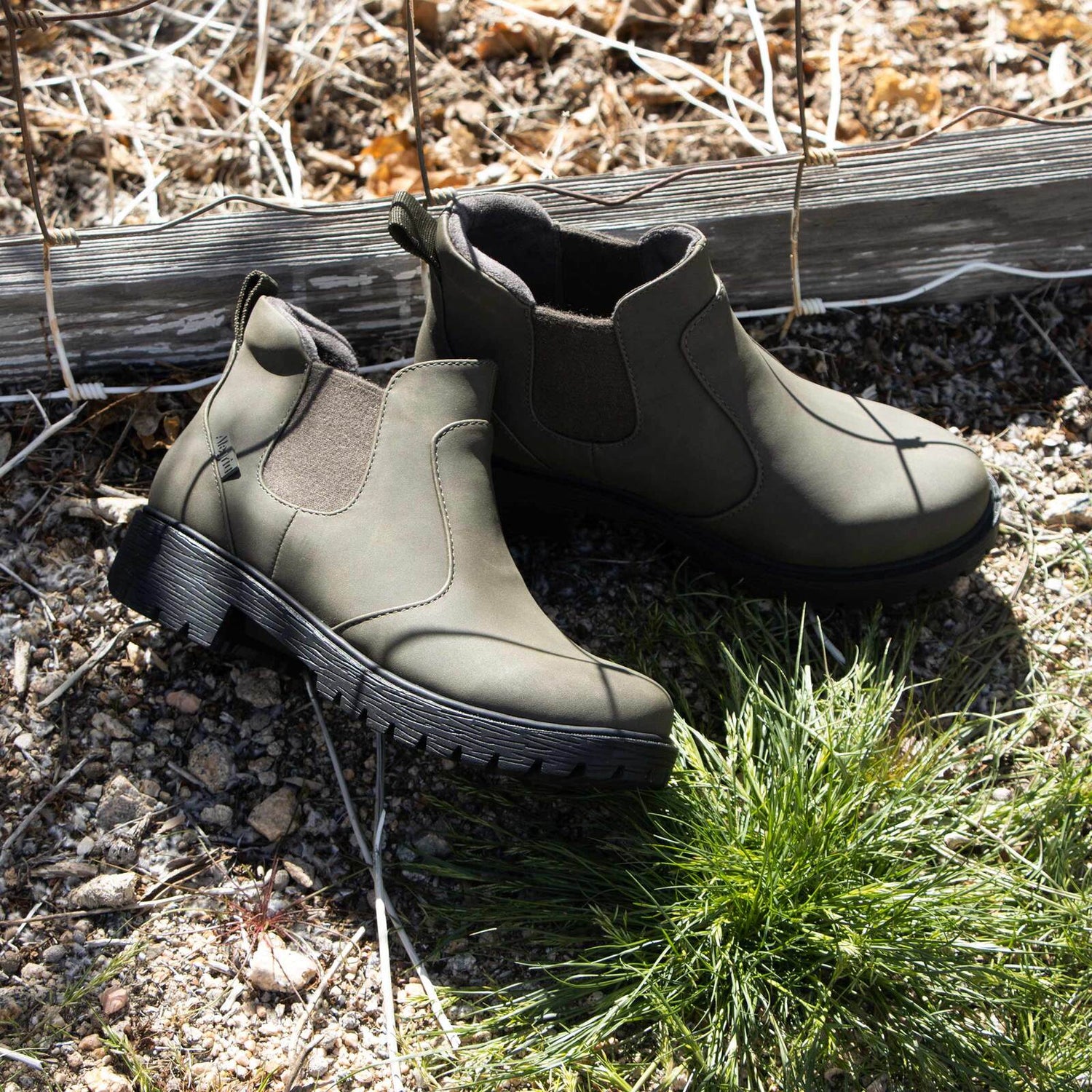 Go anywhere with this waterproof Chelsea boot! The Rowen is made with a vegan leather upper and warm lining that keep your feet and toes cozy. The double elastic gores and back pull tab make for easy on-and-off while standing tall on the slip-resistant luxe lug outsole. Featured in a Relaxed Moss colorway on a vegan leather upper. • Waterproof taped seams.