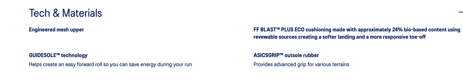 FF BLAST™ PLUS ECO technology is placed in the midsole to create effortless impact absorption while propelling your momentum forward. This material also creates a more dynamic feel that helps keep the shoe lightweight.