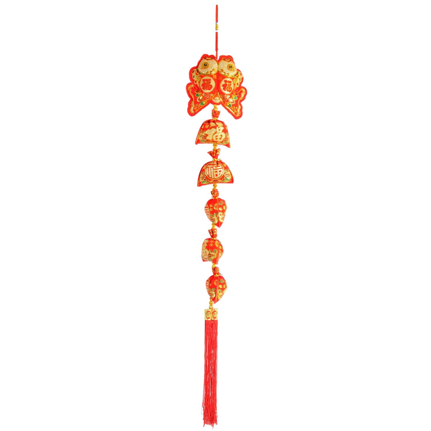 - Design details: Fish, gold accents and lucky money symbols with a red hanging tassel.