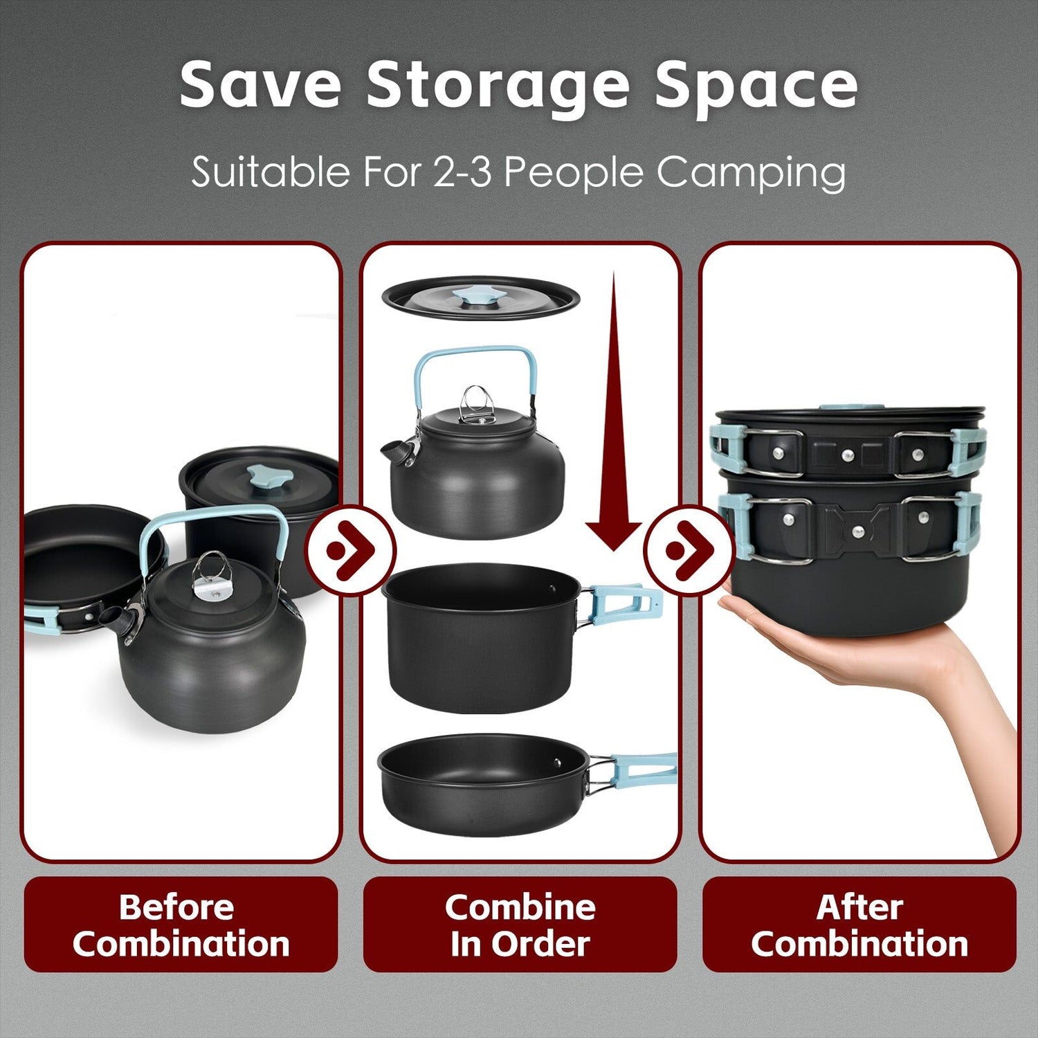 3-in-1 Outdoor Cooking Kit - 2L pot with lid, 800ml kettle, and 800ml frying pan for versatile meal preparation.