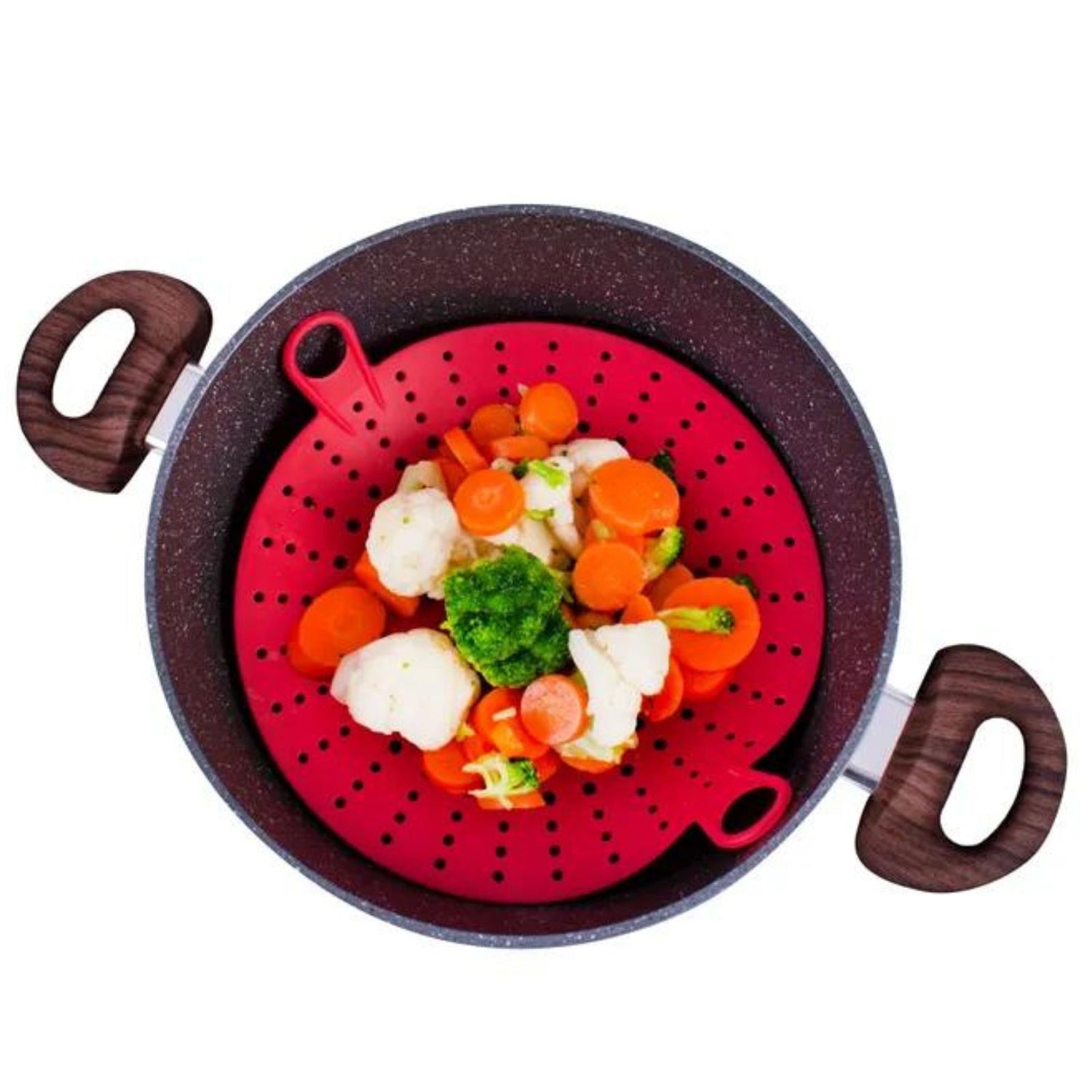 Steam your vegetables easily with this flexible non-degradable food safe silicone steamer. The handy 20cm size fits most pots. Heat-resistant side loop-handles for easy lifting. Dishwasher-safe top rack only.