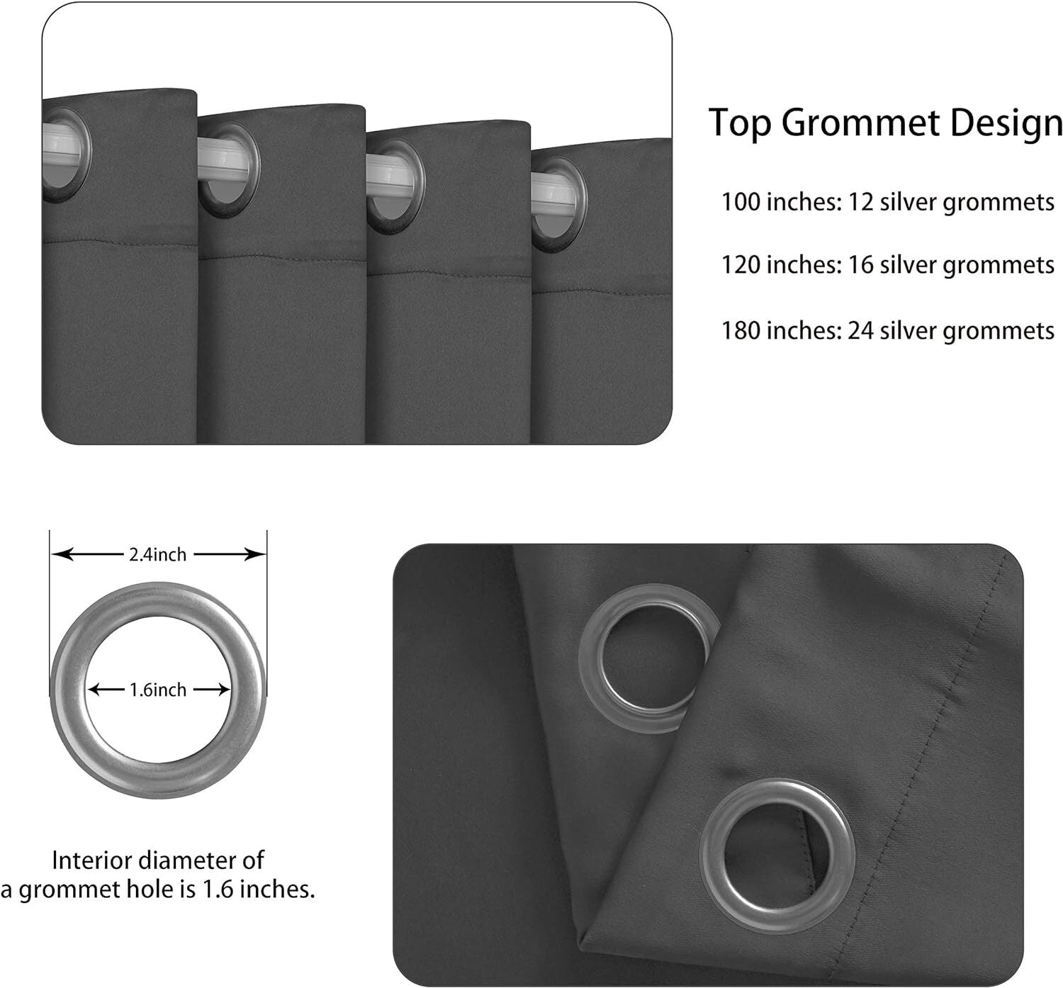 - WHAT'S IN THE PACKAGE? Each set includes 1 dark grey curtain panel, and each window drape measures 100-inch width by 84-inch length. 12 elegant silver metal grommets with 1.6-inch inner diameter, fit well with standard or decorative curtain rods, which makes the curtains easy to install and slide.