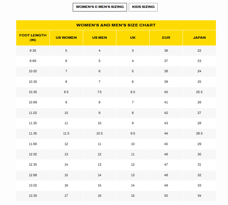 - Branding: Black and yellow branded details on heel strap and tongue.