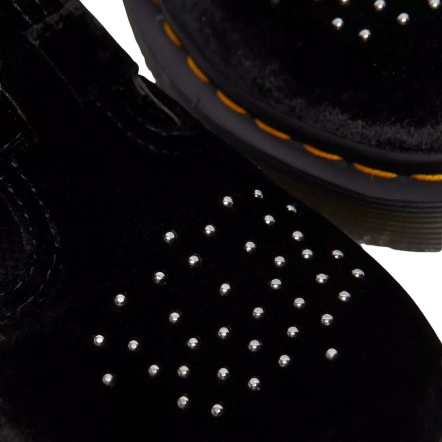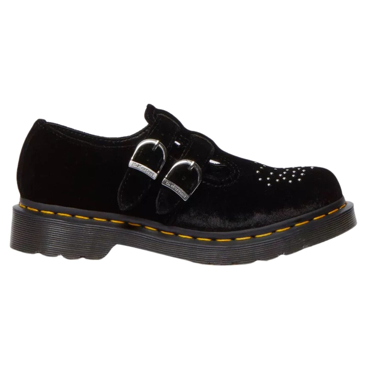 The Dr. Martens Vegan 8065 Mary Jane takes a classic silhouette and gives it a darkly romantic, grunge-inspired twist. Made from luxe black velvet — soft, silky, yet tough — this vegan-friendly rework features double buckle straps, silver horseshoe hardware and studded brogue-style detailing. Sitting on the iconic Dr. Martens sole with yellow welt stitching, it’s where vintage charm meets rebellious spirit.