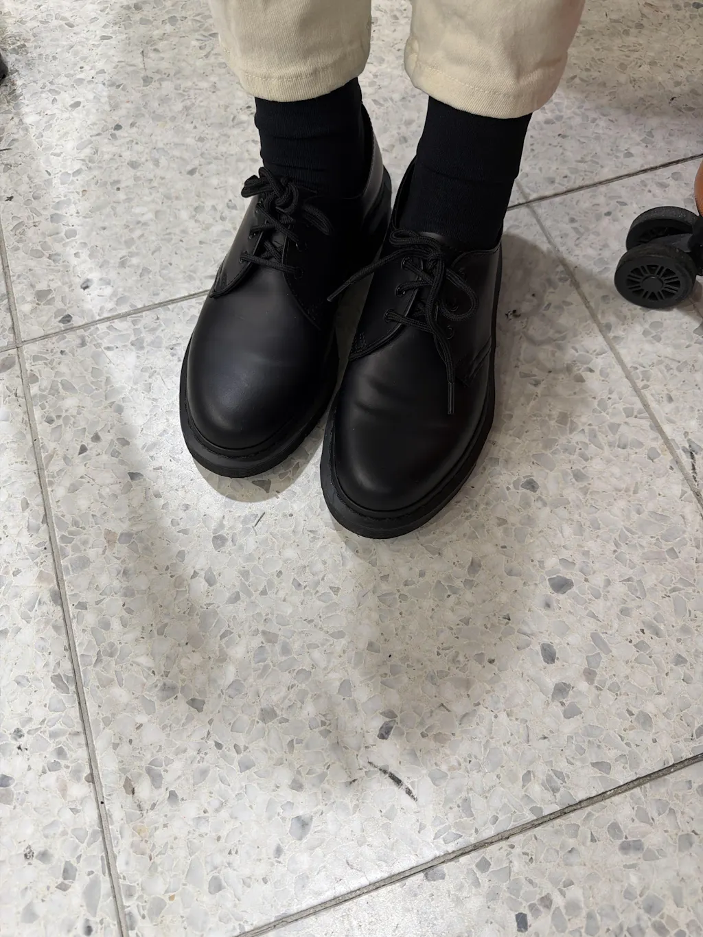 The Dr Martens black Felix Rub Off is a high-shine synthetic material with a premium feel and a subtle, two-tone finish. But the unisex shoe is still a Doc through and through, with grooved sides, yellow stitching and our iconic air-cushioned sole, that's oil-and-fat resistant with good abrasion and slip resistance. Best of all, the shoe's sole is secured using one of the finest methods of construction: the Goodyear Welt.