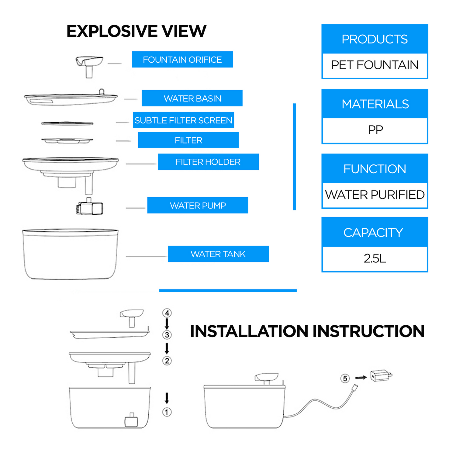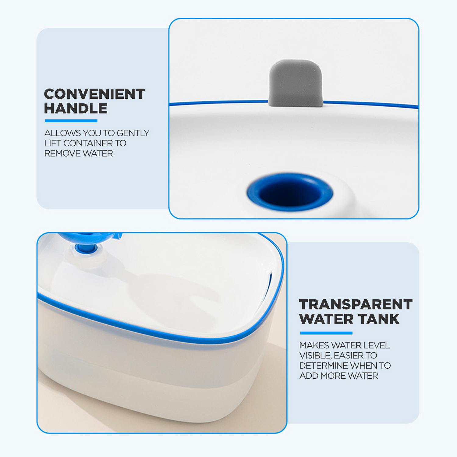 - Large capacity of 2.5 liters, storing water that can last for more than a week, reducing the need for frequent refills.