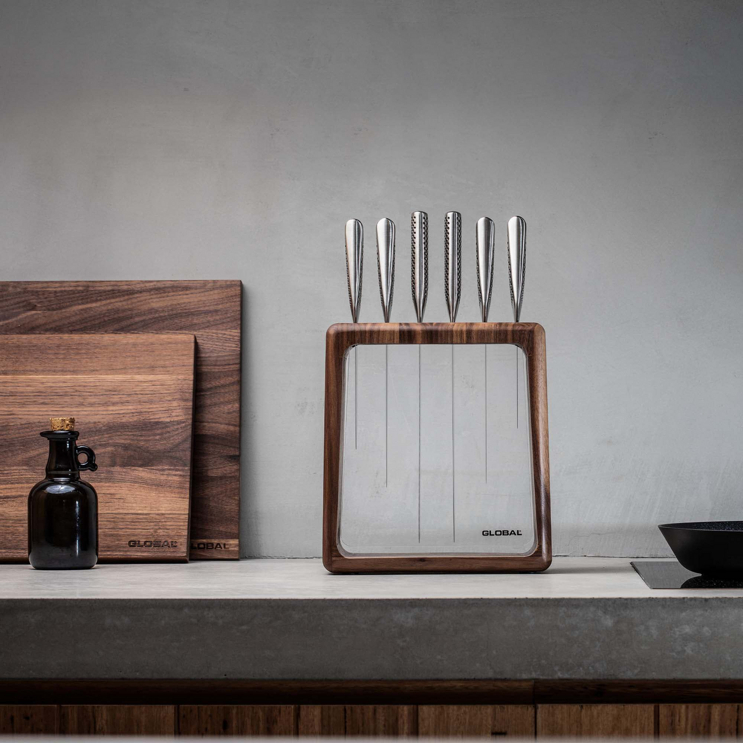 The 7 Piece HASHIRA Knife Block set includes the 6 best selling knives, all housed in an elegant walnut storage block. This knife block features a clear acrylic window at the front which not only allows your knife to be stored safely, but also allows the knife blades to be on display in the kitchen.