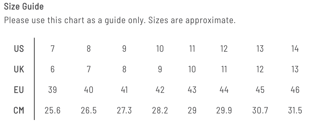 UK/AU | US | EU | Length (outersole) | Width (outersole) |