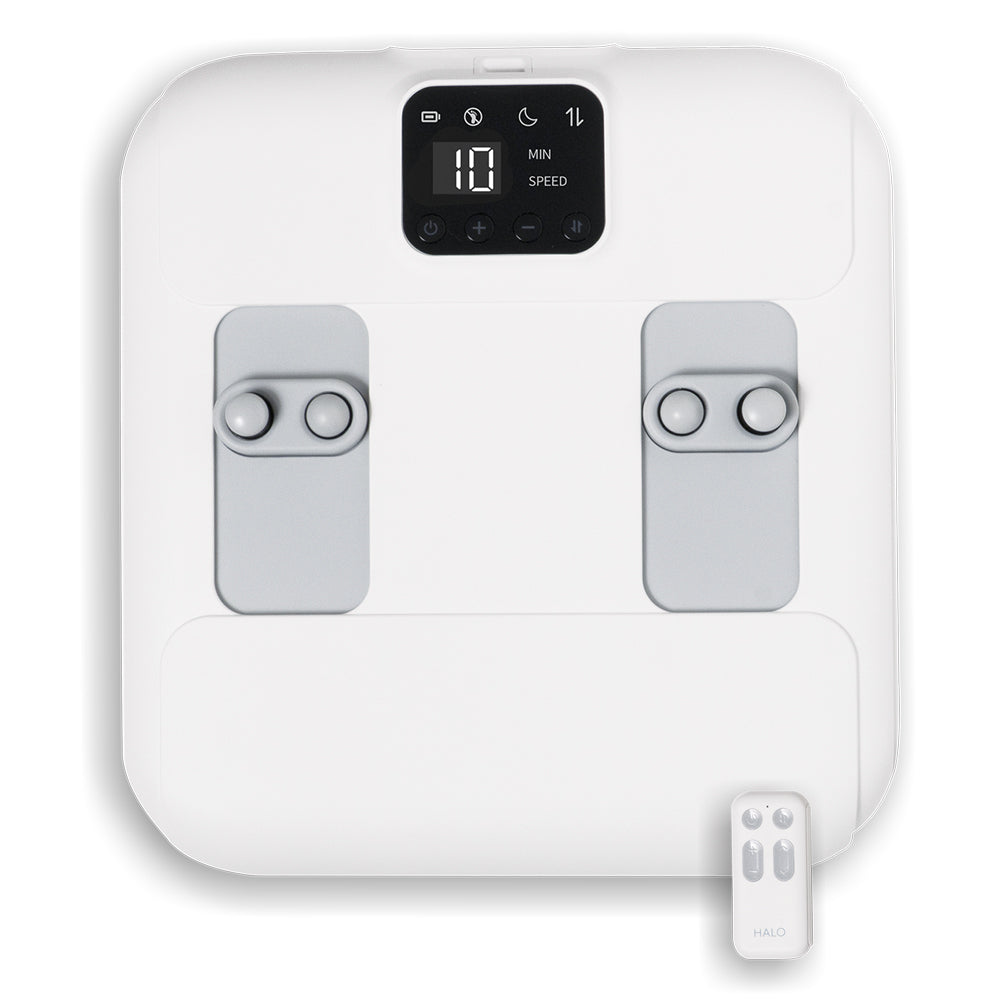 HALO Percussion Foot Massager - Percussive foot massager designed to relieve tension, stimulate circulation, and target key pressure points from heel to toe. Offers two modes: stationary percussion for focused relief, or rolling movement that mimics the sensation of walking massage. Delivers massage gun-style percussion combined with a sweeping motion that covers the entire foot. Features 10 intensity levels, cordless operation, and up to 100 minutes of use per charge. Includes auto shut-off and a compact remote that stores neatly inside the unit for convenience.