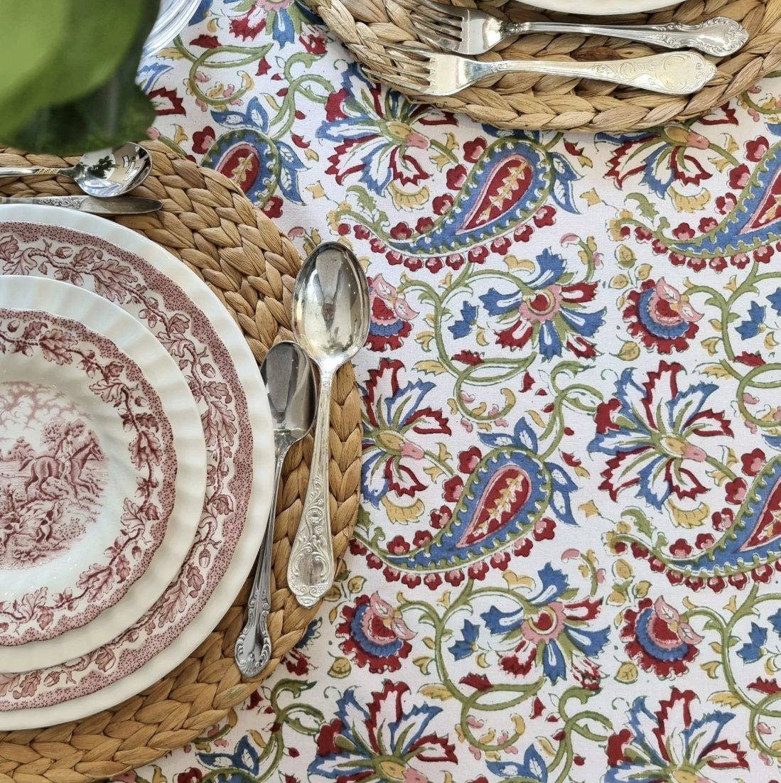 Our signature pattern, the beautiful Indian Paisley inspired by the Mughal flowers is one of our favorites. Add a dash of color to your dining room with this handmade tablecloth in blue and ruby with a white background.Â