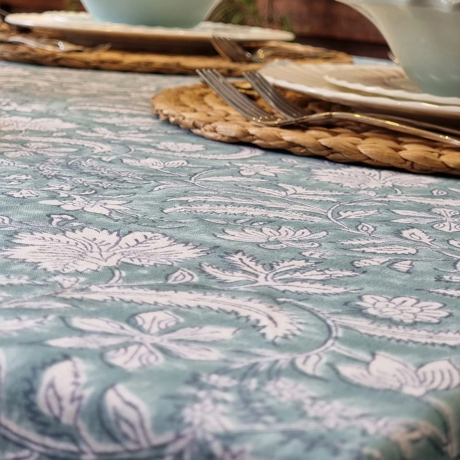 Our hand-block-printed tablecloths are artistically created by skillful artisans in Rajasthan. The tablecloth is suitable for a 6-seater dining table.Â