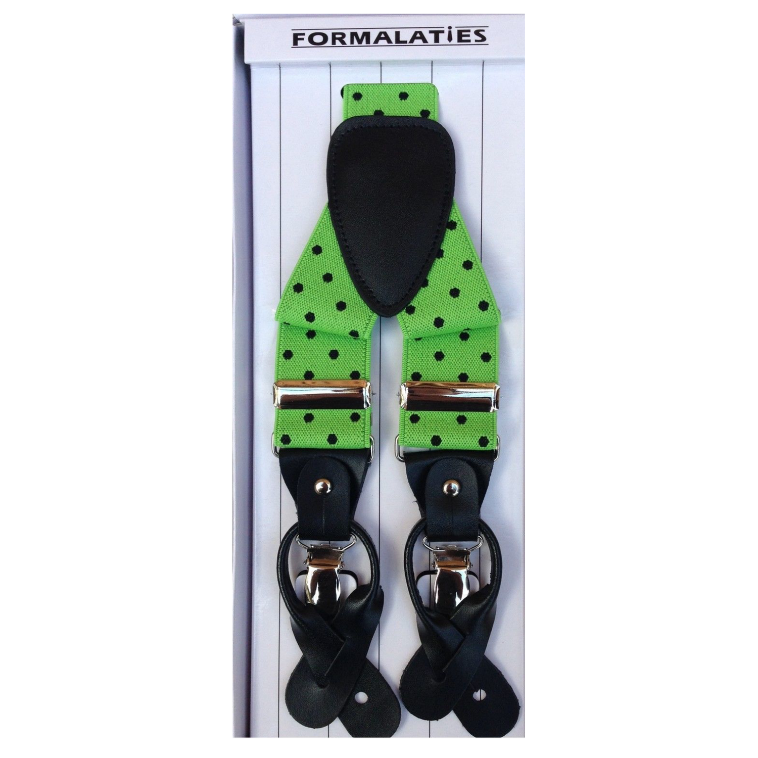 Mens Premium Convertible Suspenders Braces Clip On Elastic Y-Back Traditional Leather Tab - Polka Lime/Black