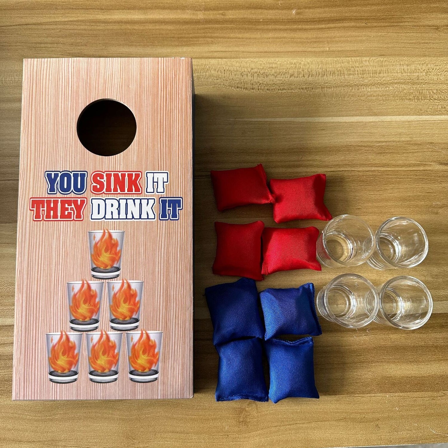 - Set includes: 1 wooden toss board, 4 shot glasses, 8 mini bean bags (4 red, 4 blue).