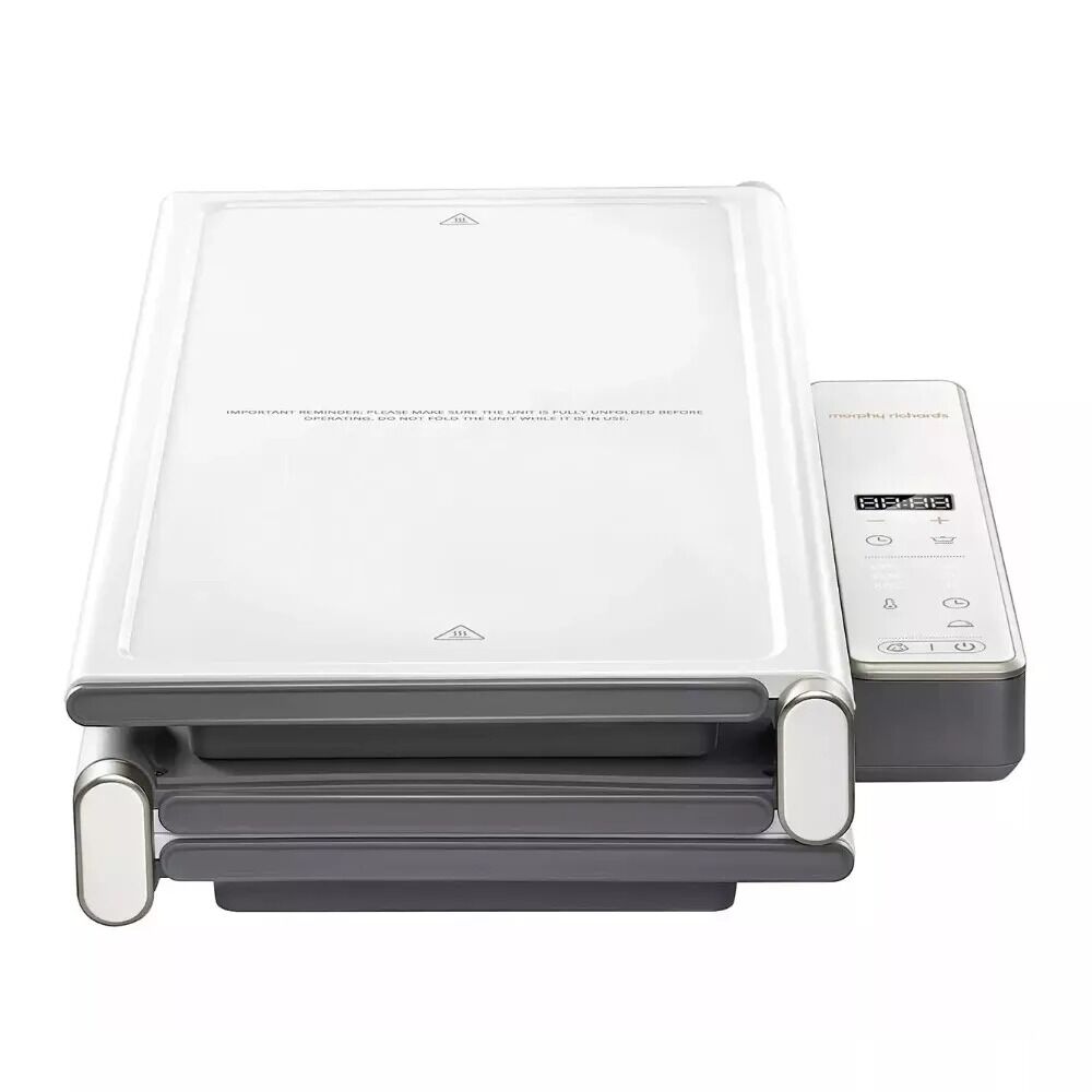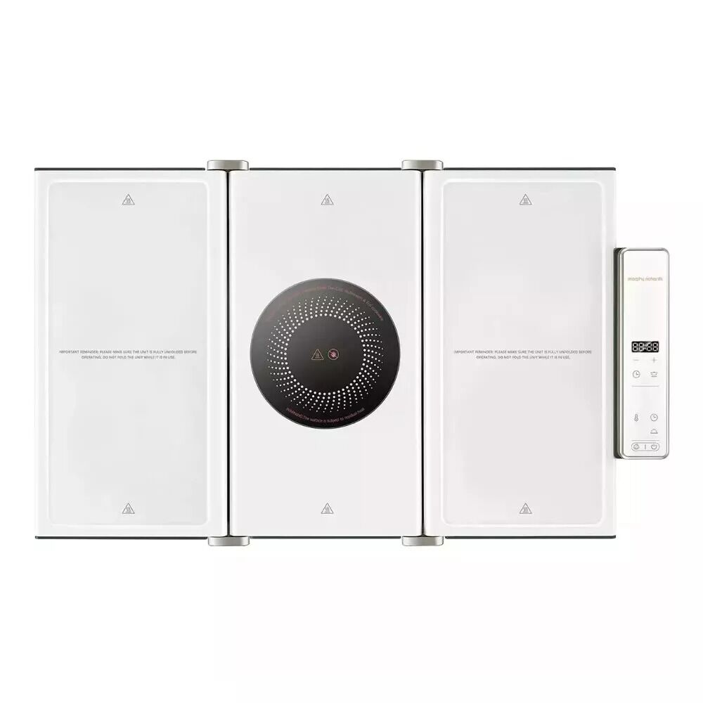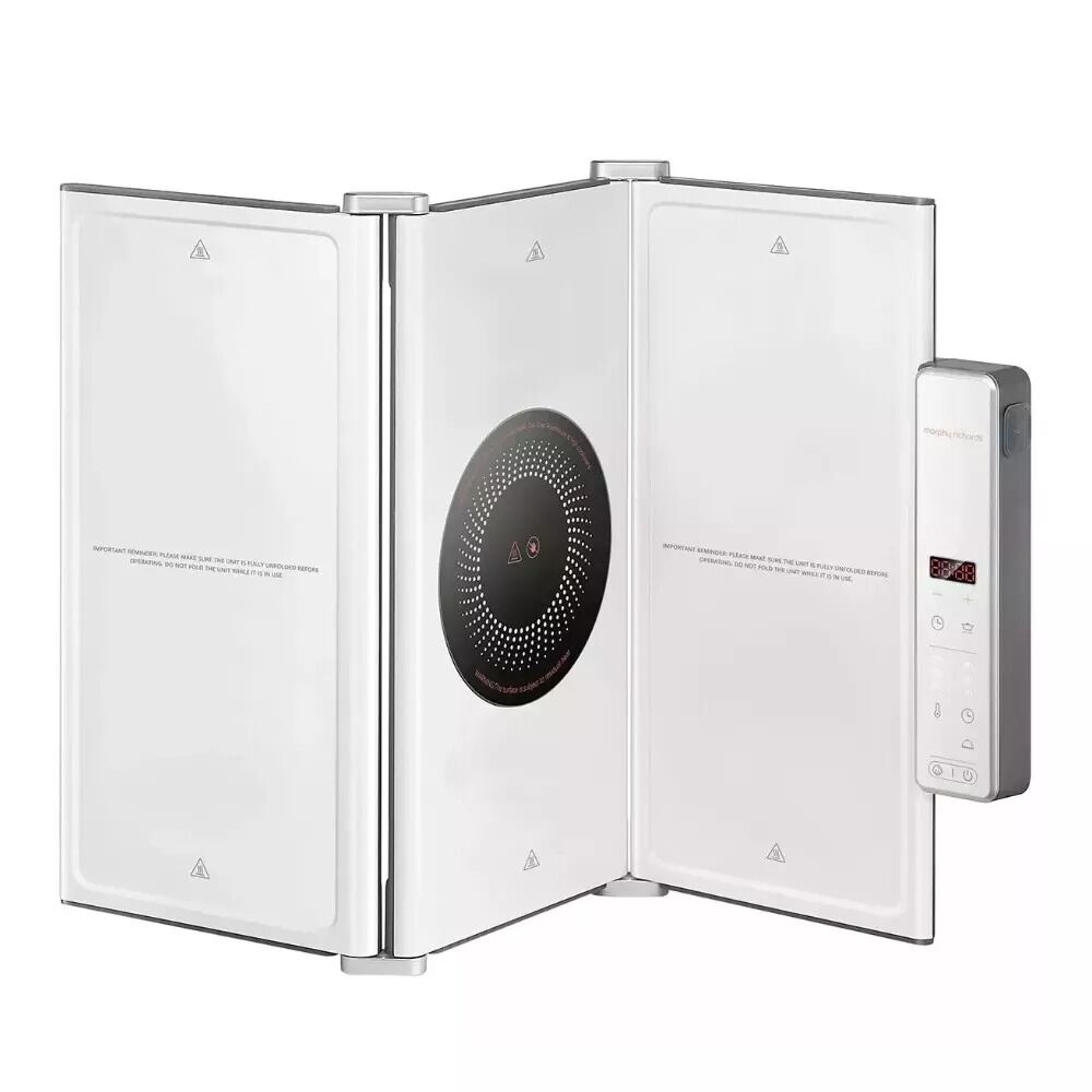 The Morphy Richards Electric Foldable Food Warmer with Hot Plate is a multifunction kitchen appliance designed to reheat, keep food warm, and cook while you eat or prepare your meals. The slimline unit comes with high-quality heating elements in two large panels and a high-temperature electric, ceramic hot plate in the centre for your cooking needs. The tri-folding compact design makes it easy to store and can fit up to 5 dishes at once for a shared meal experience. The easy operation control box and easy-to-clean ceramic-coated heating surface make this a versatile portable cooking product.