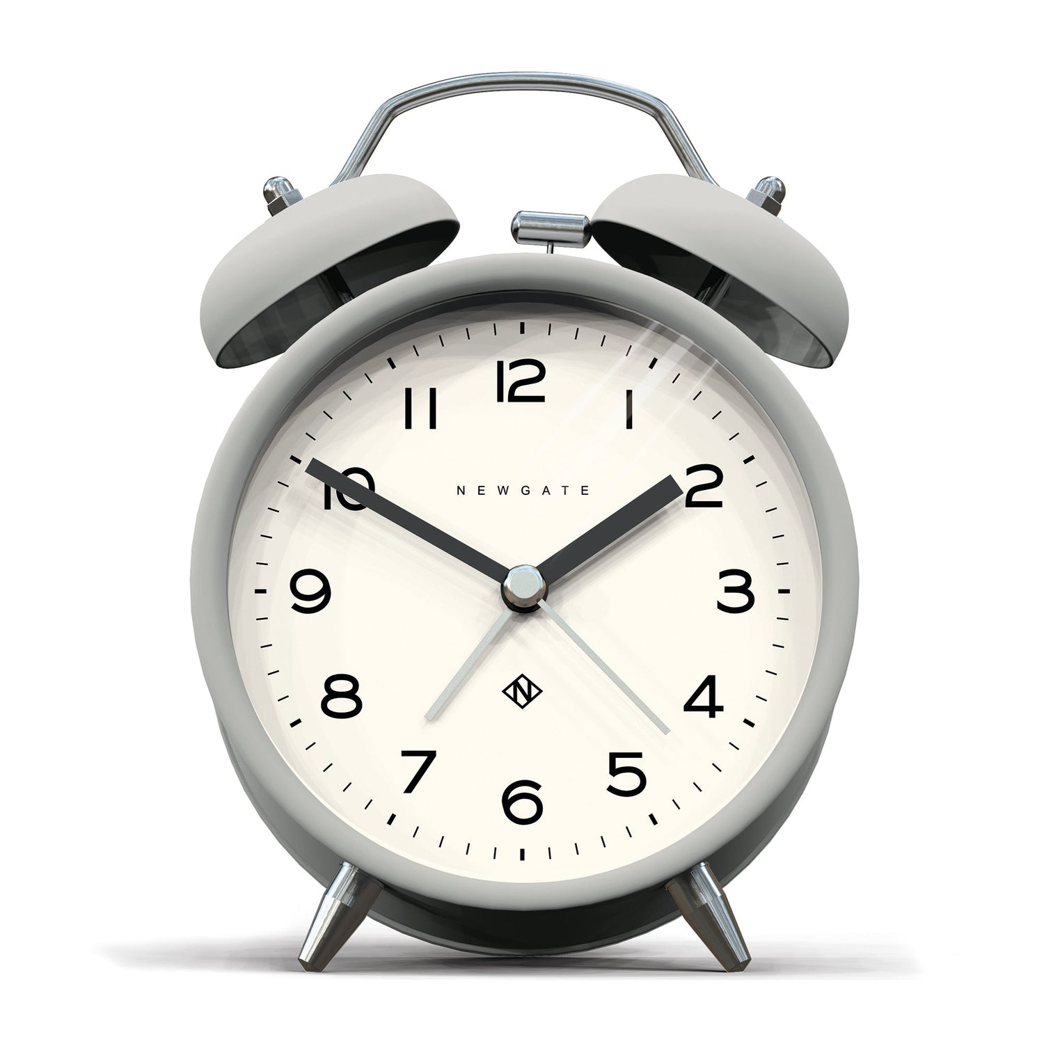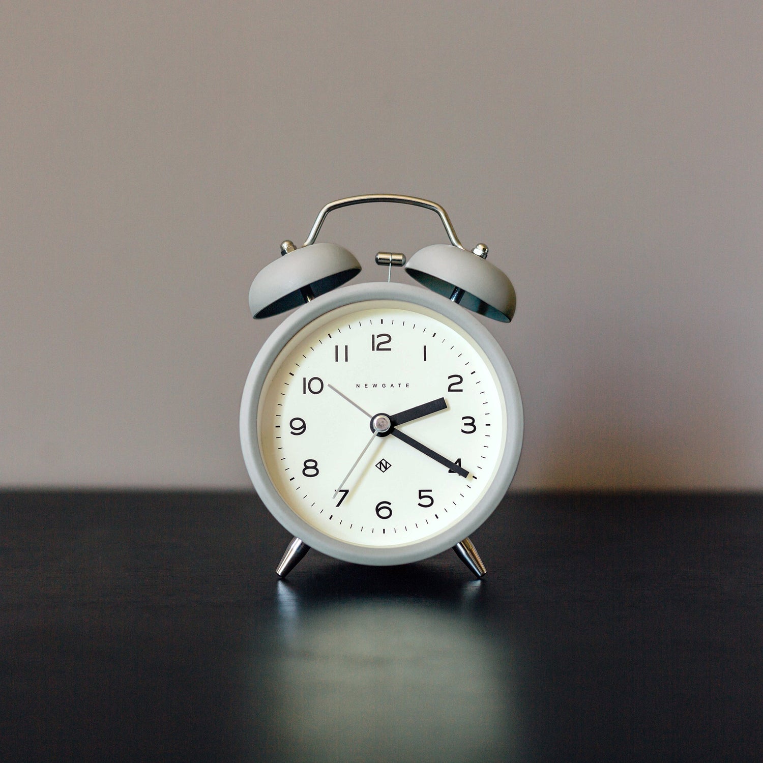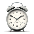 Newgate Charlie Bell Echo Matte Posh Grey A modern grey alarm clock with a contemporary graphic dial and a moving hammer and twin-bell alarm.