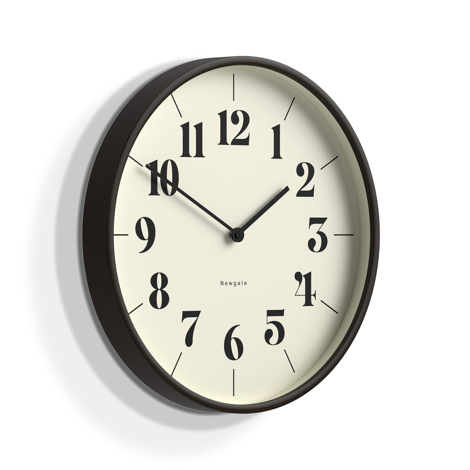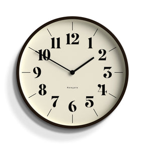 Newgate Mr Clarke Clock Dark Wood Hopscotch Dial A modern wall clock with a dark plywood case and a contemporary theatre dial.
