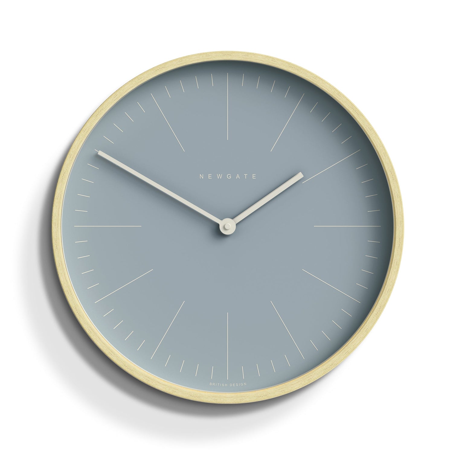 Newgate Mr Clarke Clock Pale Wood Pill Blue Dial 128 A modern Scandinavian-inspired wall clock with a pale plywood case and a contemporary ‘Pill Blue’ face with a minimalist marker dial.