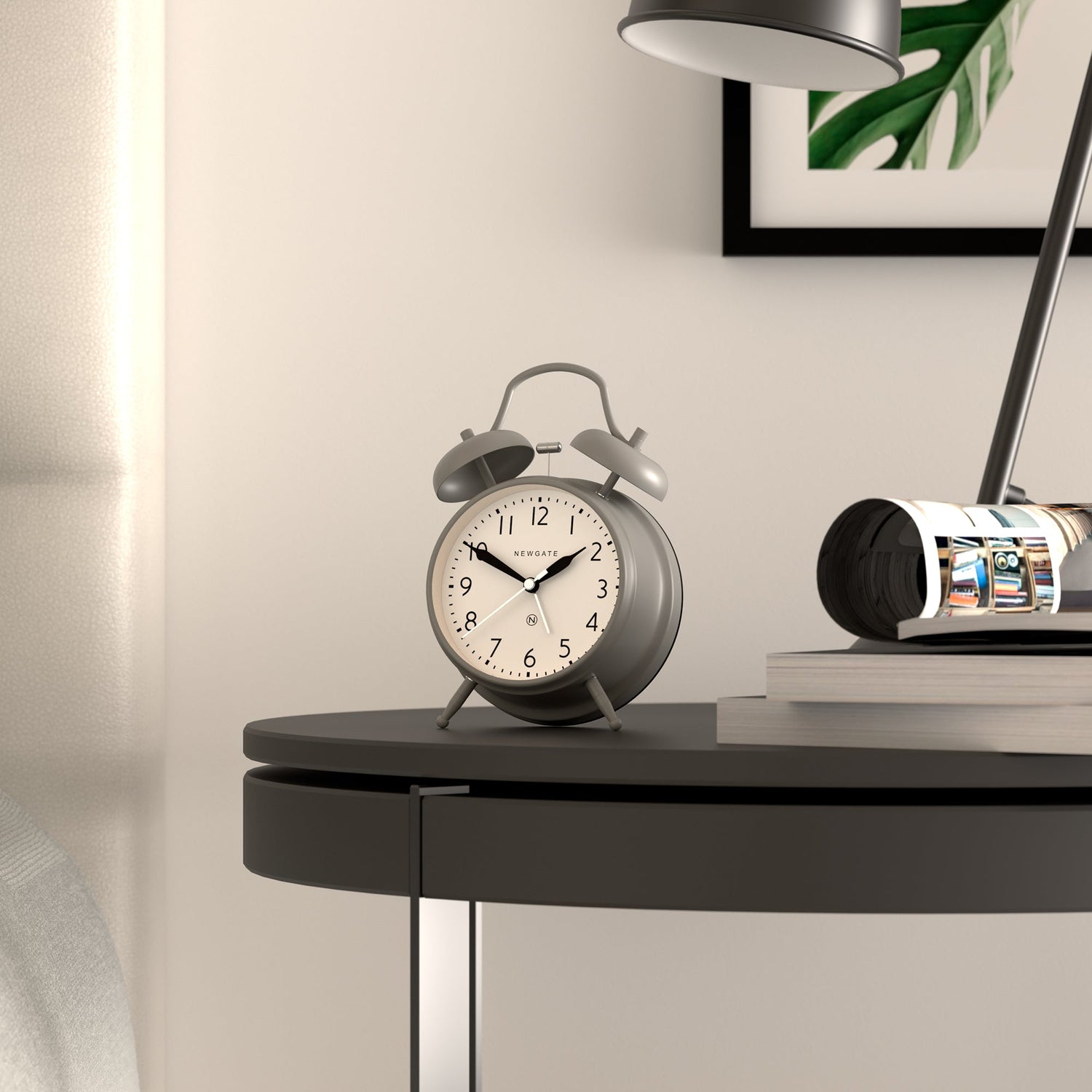 Newgate New Covent Garden Alarm Overcoat Grey Our iconic twin-bell alarm clock in classic 'Overcoat' grey. This large metal alarm clock has a contemporary dial and real moving hammer-and-bell action for a traditional wake-me-up.