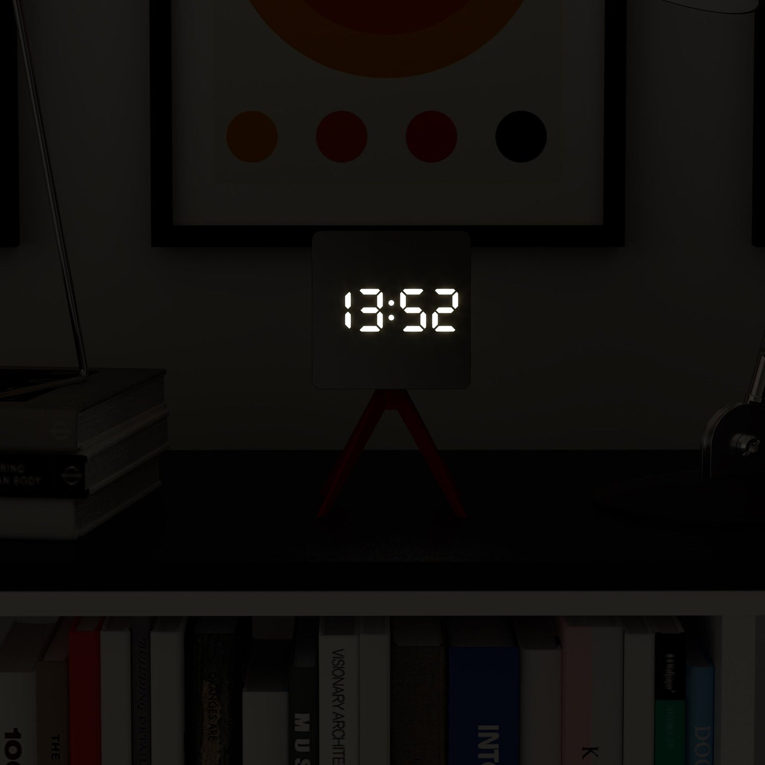 The unusual design incorporates a 12 or 24-hour time display, a digital beep alarm, a snooze function, night mode and brightness adjustment, and an optional temperature display.