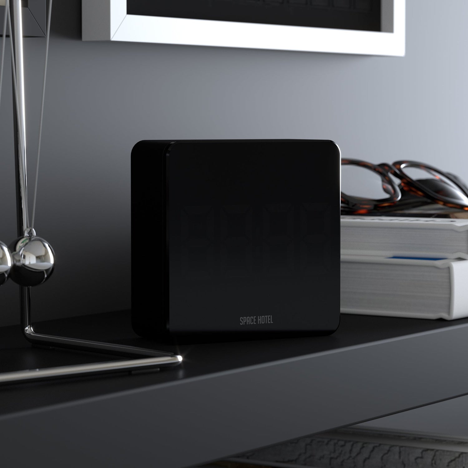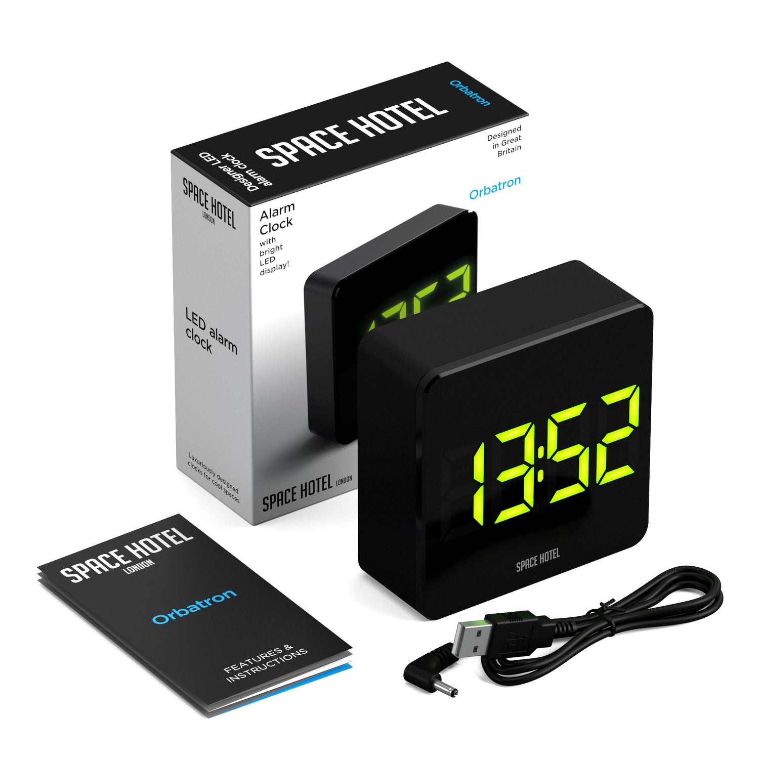 Newgate Space Hotel Orbatron Alarm Clock Black Case, Black Lens, Green Led The Orbatron is a small LED alarm clock in silver, or all-black colourway choices.