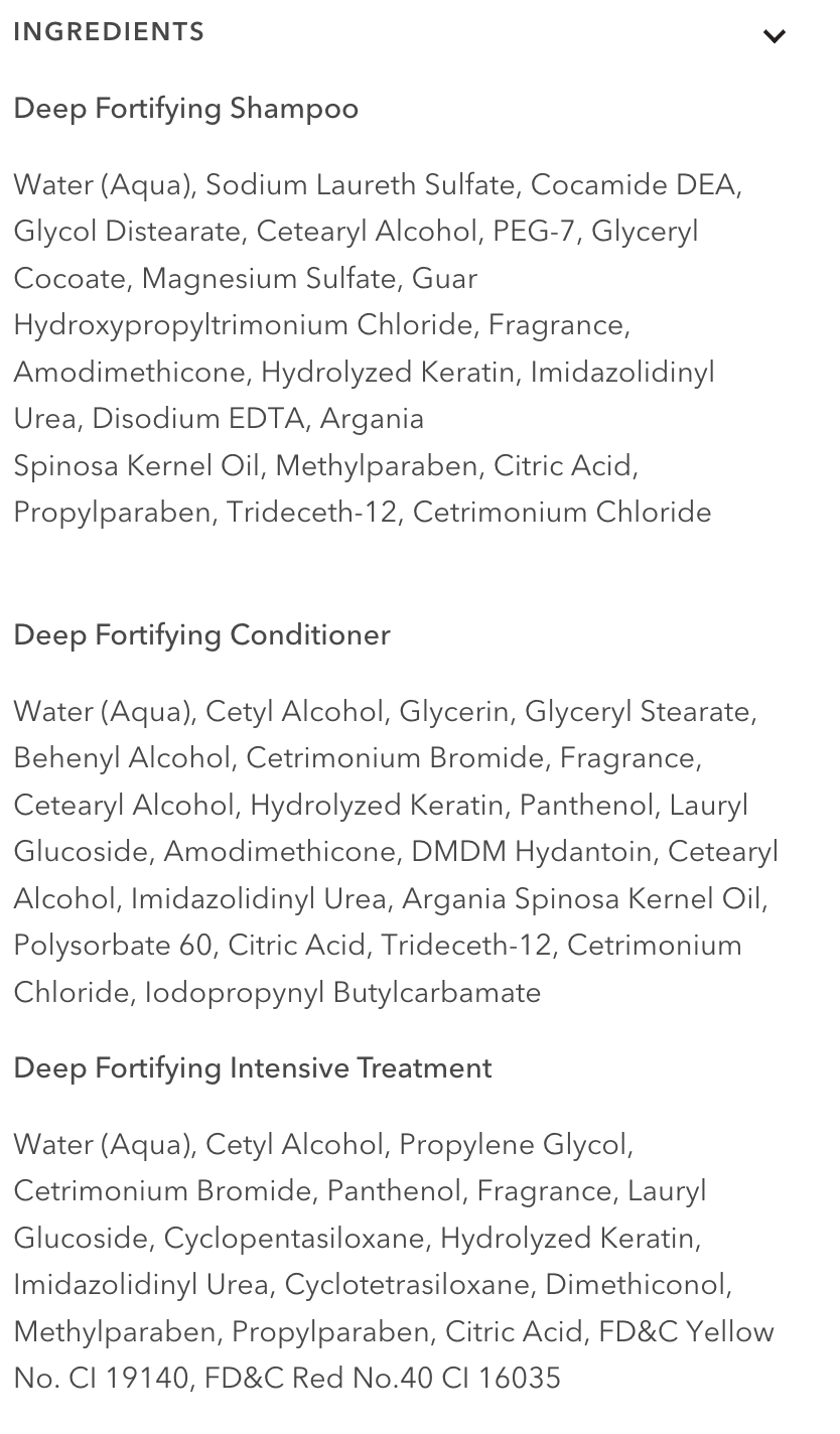 Water (Aqua), Sodium Laureth Sulfate, Cocamide DEA, Glycol Distearate, Cetearyl Alcohol, PEG-7, Glyceryl Cocoate, Magnesium Sulfate, Guar Hydroxypropyltrimonium Chloride, Fragrance, Amodimethicone, Hydrolyzed Keratin, Imidazolidinyl Urea, Disodium EDTA, Argania
