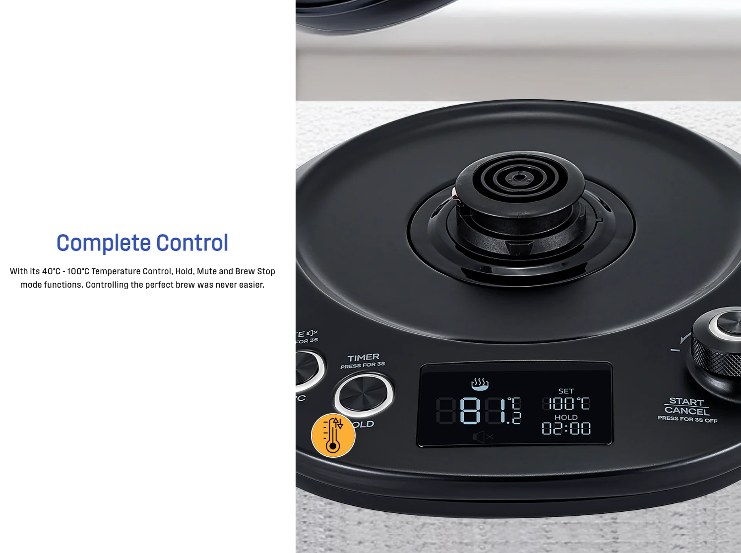 Its 800ml capacity is ideal for single serves or small batches, while the variable temperature range (40°C to 100°C) lets you dial in your ideal brew temp to a tee. The gooseneck spout gives you flawless control over your pour, and the LCD screen with dial and button control puts everything you need at your fingertips. Even better, features like Hold (up to two hours), Mute, and a built-in brew stopwatch mean you can master every cup without fuss or noise.