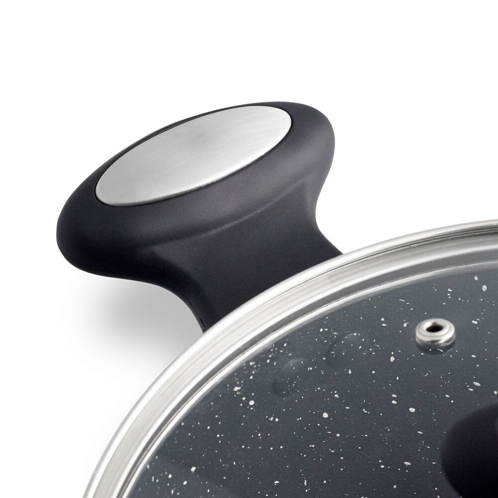 With its ergonomic soft-touch heat-resistant handle, the Zyliss Cook range is designed for maximum comfort. The Cook range is oven and grill-safe up to 180 °C, and the Dot induction base allows for advanced conductivity on most hobs, including induction. The granite-effect surface of the pan is easily cleaned, and the range is fully dishwasher safe.